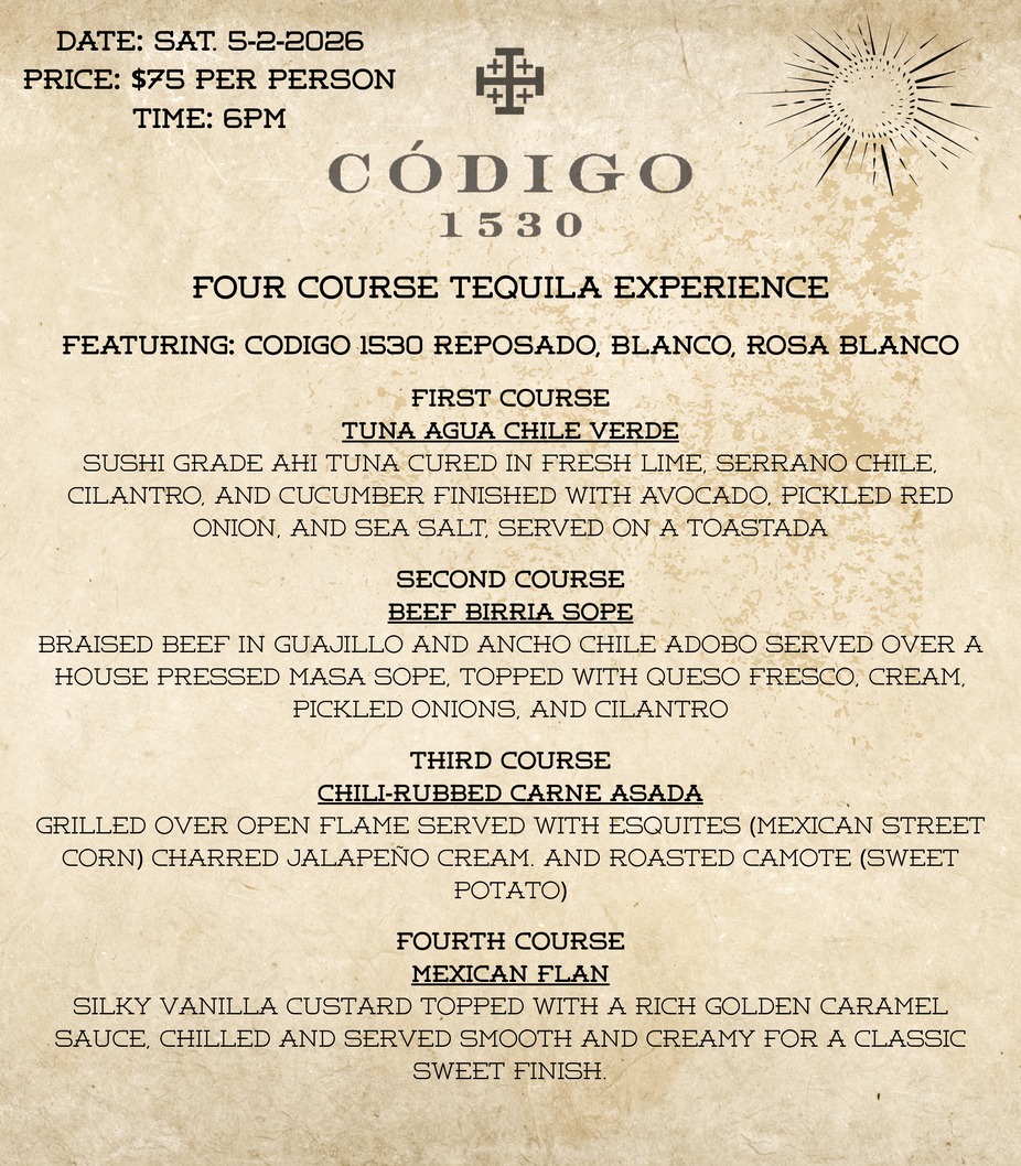 🍹 Código Tequila Dinner — May 2nd 🍹 Kick off Cinco de Mayo with a bold 4-course experience featuring Tuna Agua Chile, Beef Birria Sope, Carne Asada, and silky Mexican Flan — each complemented by Código 1530’s finest tequilas. $75 per guest | Seats will go fast! 6pm